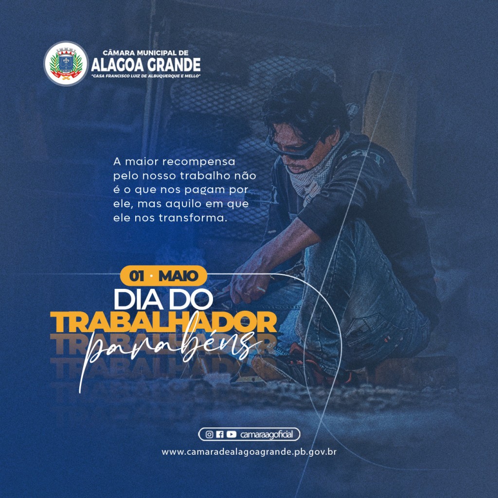 Neste 1º de maio, a Câmara Municipal de Alagoa Grande parabeniza todos os trabalhadores pelo seu dia. Queremos celebrar com todos vocês, trabalhadores, essa força que movimenta a nossa cidade, sustenta famílias, honra e dignifica o ser humano. Da iniciativa privada ao setor público, trabalhadores de todas as áreas e profissões, recebam nossa homenagem em reconhecimento à dedicação, coragem e perseverança.