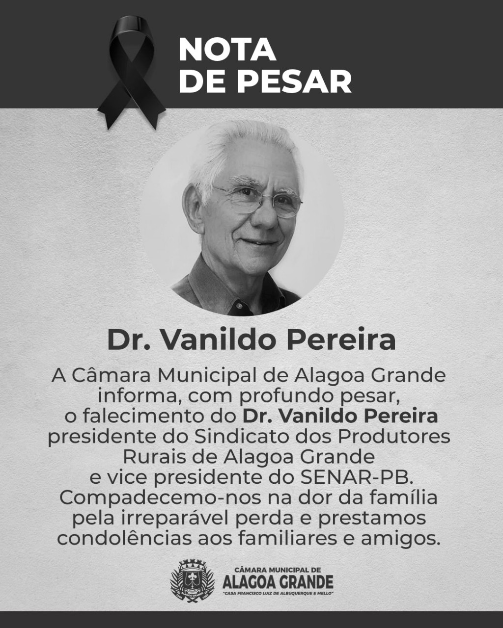 A Câmara Municipal de Alagoa Grande informa, com profundo pesar, o falecimento do Dr. Vanildo Pereira, presidente do Sindicato dos Produtores Rurais de Alagoa Grande e vice presidente do SENAR-PB. Compadecemo-nos na dor da família pela irreparável perda e prestamos condolências aos familiares e amigos.