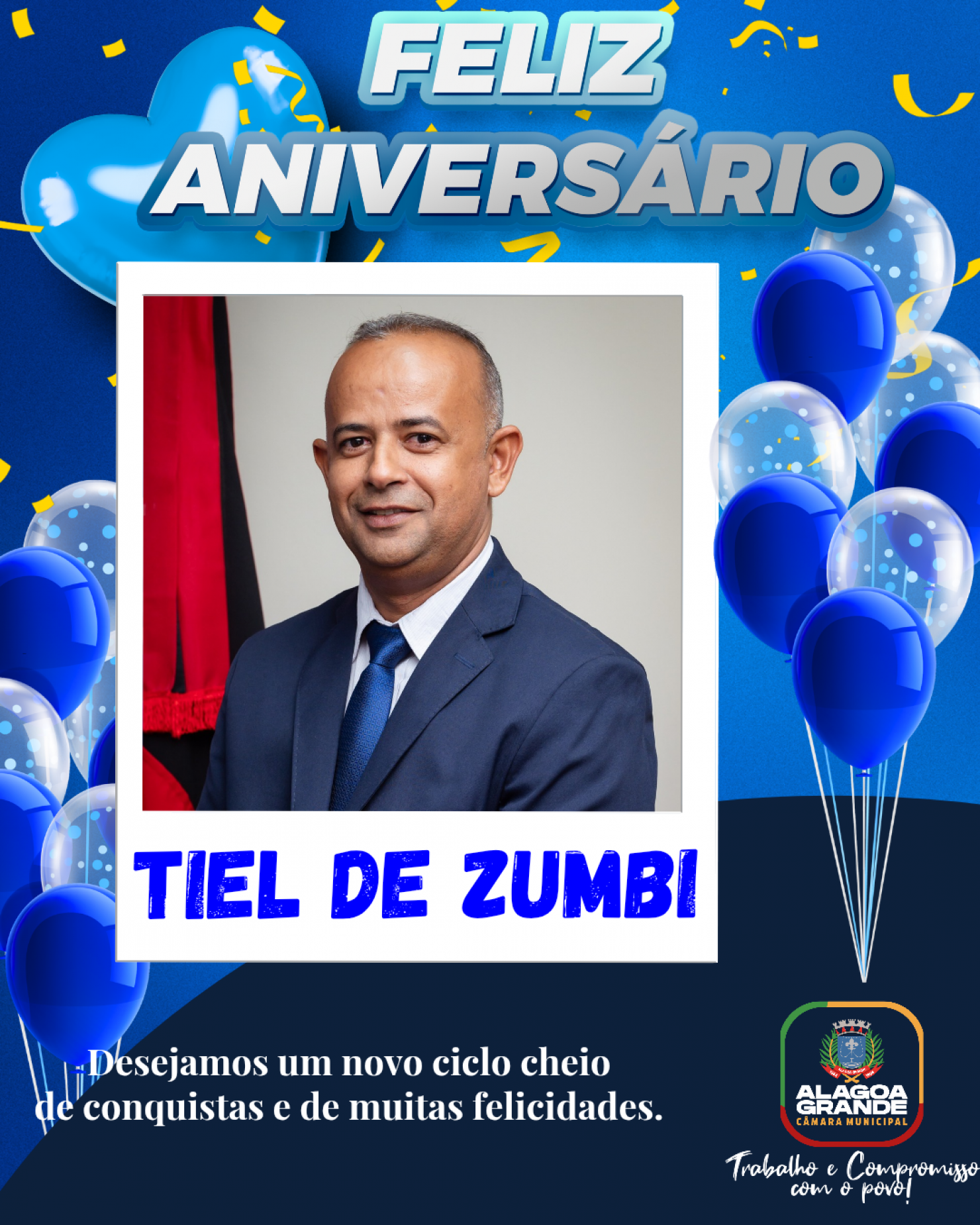 "Parabéns! 🥳 Que o seu dia seja repleto de alegria, saúde e momentos inesquecíveis. Que este novo ano de vida te traga muitas realizações e felicidades. Feliz aniversário Vereaodor Tiel!!!🎉🎂"