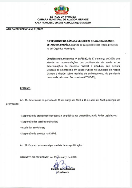 CORONAVÍRUS e o Ato da Presidência nº 01/2020, a Câmara Municipal de Alagoa