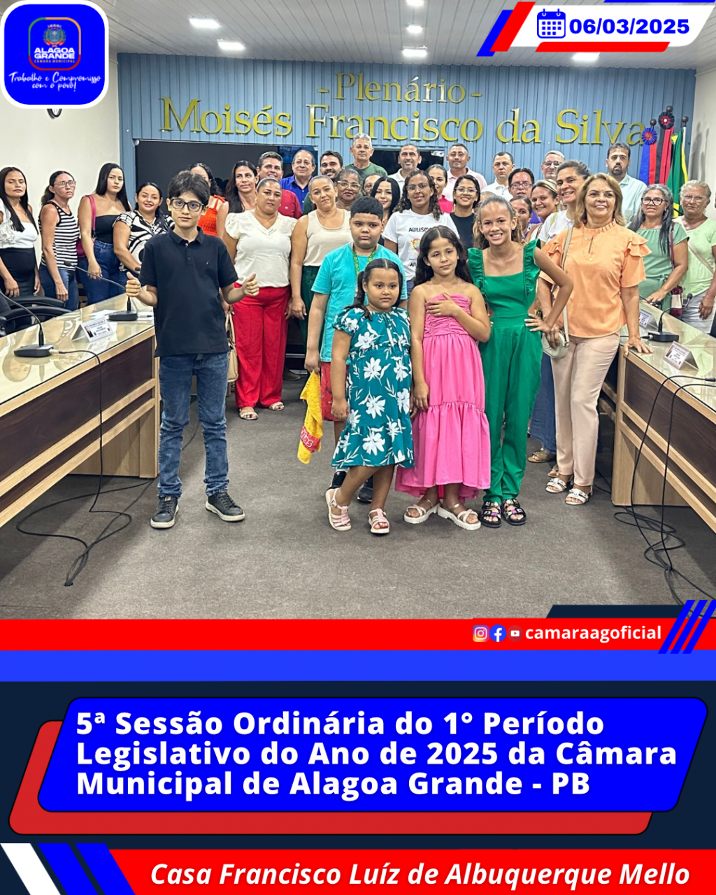 Aos seis dias do mês de março do ano de dois mil e vinte e cinco, reuniu-se a Câmara Municipal de Alagoa Grande-PB, em sua sede na rua Apolônio Zenayde, s/n. Vereadores presentes: Marcelo Carlos da Silva Presidente), Ronaldo Marques Lins (Vice-presidente), Cláudio Lúcio Barbosa (1º secretário), Carlos Marciel dos Santos (2º secretário), Ernani Cavalcante Chaves Filho, Joedson da Silva Coutinho, Éverton Flávio Ferreira Bernardo, Cláudio Roberto dos Santos, Jocélio Rodrigues da Silva, Aquillis Melo Silva e Luís Lucindo da Silva. Às 19h30min. o Presidente Marcelo declarou aberta a sessão e autorizou a leitura da ata anterior que não foi apreciada e aprovada por todos os presentes. Foram lidos em expediente: Projetos de Leis nºs 03 e 04/2025, de autoria do Chefe do Poder Executivo, o primeiro dispõe sobre a abertura de crédito adicional especial ao orçamento vigente, estabelecendo a previsão da Receita da Contribuição para Custeio do Serviço e Iluminação Pública – COSIP, nos termos do artigo 149-A da Constituição Federal da República, até o limite de R$ 1.800.000,00 (um milhão e oitocentos mil reais), e o segundo autoriza o Chefe do Poder Executivo a abertura de crédito adicional especial no valor de R$ 45.000,00 (quarenta e cinco mil reais) ao orçamento vigente para os fins que especifica, respectivamente. Foi registrada a presença do senhor Raiff Alves Régis, presidente da ONG EQUOTERAPIA SPORT HORSE, que foi convidado pra falar da atuação da referida ONG, em nosso município. Foram apresentadas as seguintes matérias: Pelo Vereador Cláudio Roberto, Requerimento nº 69/2025, solicitando melhorias no campo de futebol de Canafístula. Pela Comissão Permanente de Constituição e Justiça, Parecer Favorável ao Projeto de Lei nº 05/2025, de autoria do Vereador Joedson da Silva Coutinho, que dispõe sobre o direito de pessoas atípicas terem um acompanhante em eventos culturais, esportivos e em parques de diversões no município de Alagoa Grande e dá outras providências. Pelo Vereador Ronaldo, Requerimentos nºs 70 e 71/2025, solicitando carro fumacê e locação ou construção de imóveis pra UBSF, respectivamente. Moção de Aplausos ao Bloco das Virgens pelo brilhante desfile realizado no dia 04 de março. Pela Comissão de Finanças e Orçamento, Parecer favorável aos Projetos de Leis nºs 03 e 04/2025, de autoria do Chefe do Executivo, o primeiro dispõe sobre a abertura de crédito adicional especial ao orçamento vigente, estabelecendo a previsão da Receita da Contribuição para Custeio do Serviço e Iluminação Pública – COSIP, nos termos do artigo 149-A da Constituição Federal da República, até o limite de R$ 1.800.000,00 (um milhão e oitocentos mil reais), e o segundo autoriza o Chefe do Poder Executivo a abertura de crédito adicional especial ao orçamento vigente para os fins que especifica, respectivamente. Pelo Vereador Éverton (Tuca), Requerimentos nºs 72 e 73/2025, solicitando aquisição de um ônibus para a Secretaria de Juventude, Esporte e Lazer e perfuração de poço artesiano para comunidade rural Engenho do Meio, respectivamente. Pelo Vereador Jocélio, Requerimento nº 74/2025, solicitando a pavimentação da rua José Amâncio de Almeida na Vila São João. Pelo Vereador Marcelo, Requerimento nº 75/2025, solicitando construção de muro de arrimo na Rua São Sebastião. Foram apreciadas e votadas as seguintes matérias constantes na ordem do dia: Projetos de Leis nºs 03 e 04/2025, autor,Chefe do Executivo, mencionados acima. Foram apreciados por Aquillis (líder do governo) e logo após com a autorização plenária aprovados em duas votações por unanimidade (10x0). Projeto de Lei nº 05/2025, autor: Joedson. Foi apreciado pelo autor e logo após com a autorização plenária aprovado por 10x0, em duas votações. Requerimentos nºs 56 e 57/2025, autor: Ernani (Duca Chaves). Foram apreciados pelo autor e logo após aprovados por unanimidade. Requerimento nº 58/2025, autor: Éverton. Foi apreciado pelo autor e por Ronaldo, logo após aprovado por unanimidade. Requerimento nº 59/2025, autor: Joedson. Foi apreciado pelo autor e logo após aprovado por unanimidade. Requerimentos nºs 62 e 63/2025, autor: Ronaldo. Foram apreciados pelo autor e logo após aprovados por unanimidade. Requerimentos nºs 64 e 65/2025, autor: Aquillis. Foram apreciados pelo autor e logo após aprovados por unanimidade. Requerimento nº 66/2025, autor: Cláudio Roberto (Robertão). Foi apreciado pelo autor e logo após aprovado por unanimidade. Requerimento nº 67/2025, autor: Jocélio. Foi apreciado pelo autor e logo após aprovado por unanimidade. Requerimento nº 68/2025, autor: Marcelo. Foi apreciado pelo autor e logo após aprovado por unanimidade. Em seguida atendendo ao Requerimento nº 38/2025, de autoria do vereador Joedson (Zé do Povo) foi cedido um espaço na sessão ao senhor Raiff Alves Régis, presidente da ONG EQUOTERAPIA SPORT HORSE, que ao usar a tribuna fez uma explanação sobre a atuação da referida ONG, os benefícios da EQUOTERAPIA e os transtornos assistidos pela mesma, que atende crianças e jovens, conforme descritos a seguir: Transtorno do Espectro Autista, TDAH, Sindrome de Down, Paralisia Cerebral, TOD, Microcefalia, Hipoxia, Ansiedade, Depressão e Distúrbio de aprendizagem e linguagem. O palestrante explicou o que é a equoterapia, um método terapêutico que utiliza os cavalos dentro de uma abordagem interdisciplinar nas áreas de saúde, educação e equitação. Em seguida os vereadores fizeram perguntas ao palestrante, que atendeu a todos respondendo os questionamentos. Também foi concedido um espaço a senhora Adriana Araújo, representante das famílias das crianças e jovens assistidos pela ONG, a Médica e empresária Drª Josenilde Medeiros e a