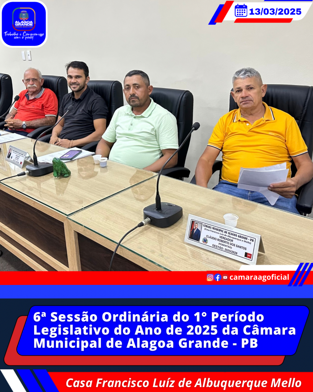Aos treze dias do mês de março do ano de dois mil e vinte e cinco, reuniu-se a Câmara Municipal de Alagoa Grande-PB, em sua sede na rua Apolônio Zenayde, s/n. Vereadores presentes: Marcelo Carlos da Silva (Presidente), Ronaldo Marques Lins (Vice-presidente), Cláudio Lúcio Barbosa (1º secretário), Carlos Marciel dos Santos (2º
