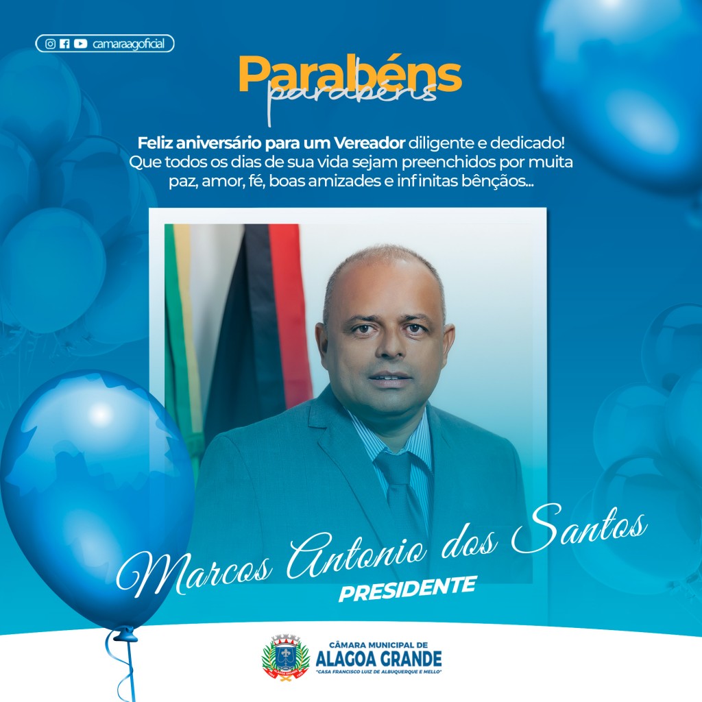 Hoje é dia de parabenizar o presidente, MARCOS ANTONIO DOS SANTOS, pelo seu natalício. Esperamos que possa celebrar esta data na companhia daqueles que mais ama e o nosso desejo para que tenha um dia muito feliz e que na sua vida nunca lhe falte saúde, esperança, paz e sucesso. Parabéns também pela sua atuação e dedicação como parlamentar, bem como a sua boa condução dos trabalhos desta Casa Legislativa. Feliz Aniversário presidente! Que todos os dias de sua vida sejam preenchidos por muita paz, amor, fé, boas amizades e infinitas bênçãos... Receba os