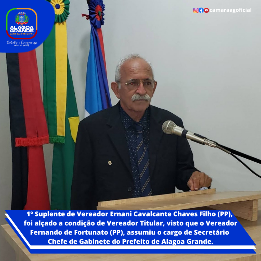 Tomou posse na manhã desta terça-feira (10), o 1° Suplente de Vereador pelo PP, o senhor Ernani Cavalcante Chaves Filho, em decorrência do Vereador Titular Fernando de Fortunato (PP), assumir o cargo de Chefe de Gabinete do Prefeito de Alagoa Grande.