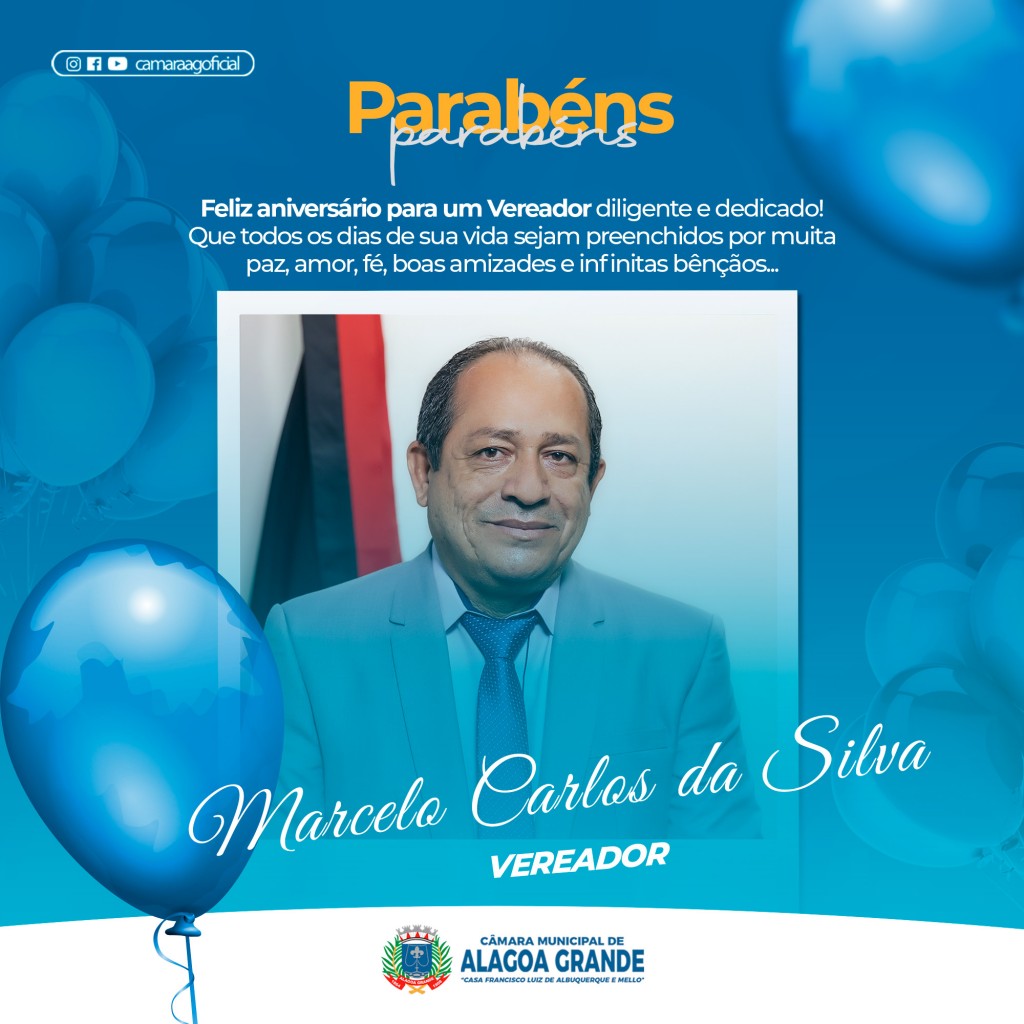 Hoje é dia de parabenizar o vereador Marcelo Carlos da Silva, pelo seu natalício. Esperamos que possa celebrar esta data na companhia daqueles que mais ama e o nosso desejo para que tenha um dia muito feliz e que na sua vida nunca lhe falte saúde, esperança, paz e sucesso.